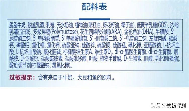 采用的A2奶源中含有A2-β酪蛋白,A2-β酪蛋白与母乳的酪蛋白结构比较接近,因此比较亲和人体。可惜,这款奶粉使用乳粉作为奶基原料生产,乳粉经过二次加工,奶粉的新鲜度和营养保留度都大打折扣,有点浪费这么好的A2奶源。营养方面,在6个基础强化配方中,它只有DHA、ARA、胆碱、益生元4个,缺少了核苷酸和牛磺酸。其中DHA添加量有4.64mg/100kj。特色强化配方是加入了OPO结构脂、叶黄素、β-胡萝卜素和OPN这4个。OPN即骨桥蛋白,它具有免疫调节活性、组织重塑、骨形成以及细胞附着、迁移、增殖等功能。叶黄素和β-胡萝卜素对眼部发育有帮助。OPO结构脂能优化钙和脂肪酸的吸收,还可以软化便便,降低便秘几率