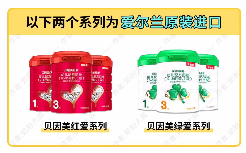 2、如果希望购买进口,可以考虑红爱系列和绿爱系列。各段数都是在爱尔兰生产,再原装进口到中国销售,当然,价格也会稍微高一点。这两个系列的奶粉各段数的可选择成分都超过10款,营养比很多海外版的大牌奶粉要丰富。