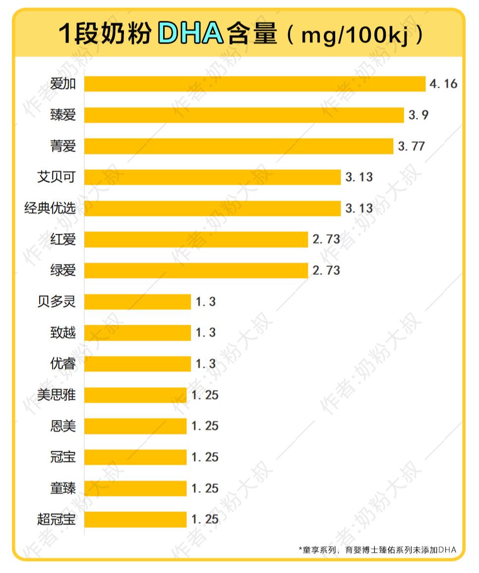 目前市面上超过90%的奶粉都添加了DHA,大部分添加了DHA的配方奶粉都会有ARA。这17个系列3段奶粉中,除了童享3段和育婴博士臻佑3段并未添加DHA和ARA,其他系列均添加了,含量也差不多,只有爱加3段DHA含量在市售多数奶粉中排名中上位置,具体含量如下: