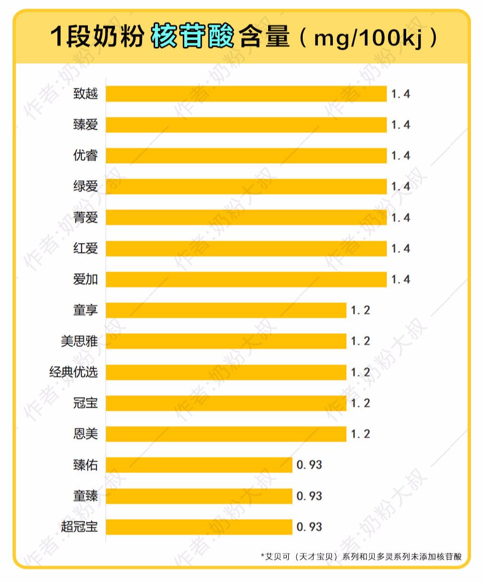 1段配方中,除了艾贝可1段(原名:天才宝贝)和贝多灵1段没有添加核苷酸之外,其他全部系列都添加了,但含量各有不同,具体如下: