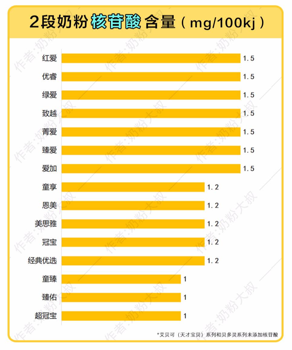 2段配方中,除了艾贝可2段(原名:天才宝贝)和贝多灵2段没有添加核苷酸之外,其他全部系列都添加了,但含量各有不同,具体如下: